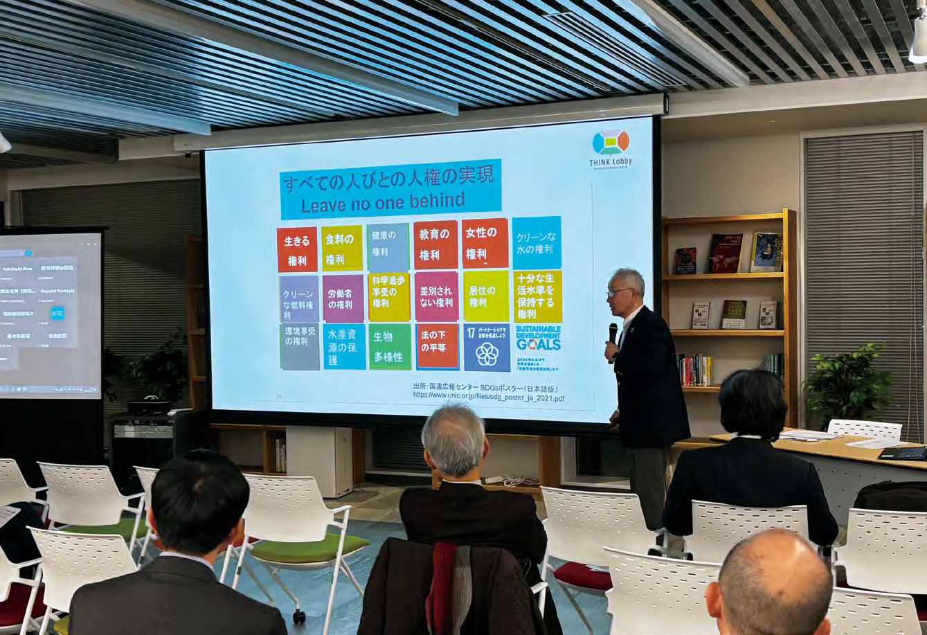 また、2022年の国連総会で「持続可能な環境と人権」の結びつきが強化されたように、気候変動への対応もまた、人権の延長線上にある喫緊の課題であることが示されました。平和を単に「戦争がない状態」と捉えるのではなく、多国間主義が機能不全に陥っている現状や、自由な言論空間(市民社会スペース)の後退と結びつけて考える必要があります。若林氏が所長を務める「THINK Lobby」では、政策を通じて社会を変える「ロビーイング」の文化を日本に確立しようとしています。