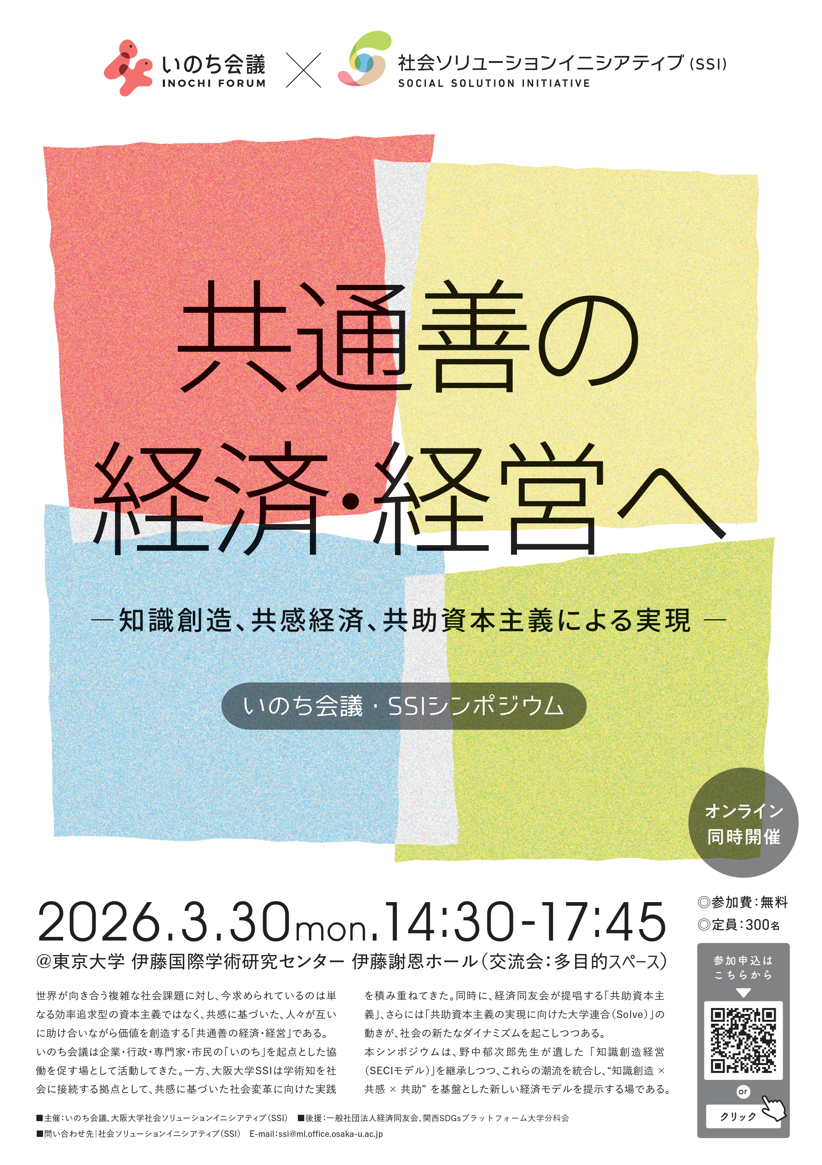 いのち会議は企業・行政・専門家・市民の「いのち」を起点とした協働を促す場として活動してきた。一方、大阪大学SSI は学術知を社会に接続する拠点として、共感に基づいた社会変革に向けた実践を積み重ねてきた。同時に、経済同友会が提唱する「共助資本主義」、さらには「共助資本主義の実現に向けた大学連合(Solve)」の動きが、社会の新たなダイナミズムを起こしつつある。