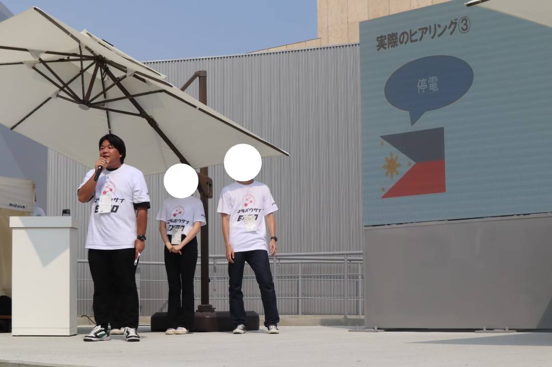 そして、今年度は、プロジェクト名にもあるように、フィリピンでの防災課題の解決に取り組みました。一般社団法人大阪青年会議所が実施する実践的グローバルリーダー育成プログラム「Co-creation Launching Bridge Osaka(Co-LaBo)」に戎井が参加。津田地区で行われてきた防災活動のノウハウ、実践経験をフィリピンでの防災課題解決に活かすとともに、国外での防災の取り組みや災害リスクを学ぶことによって、日本の防災課題解決にも役立てました。戎井が参加した班では、フィリピン現地でのリアルなニーズと日本の製造業が持つ技術やネットワークを掛け合わせることで、真の防災課題解決につなげるビジネスプランを考え、大阪関西万博電力館「可能性のタマゴたち」の屋外ステージにて行われた「コラボウサイEXPO」にてプレゼンピッチを行いました。