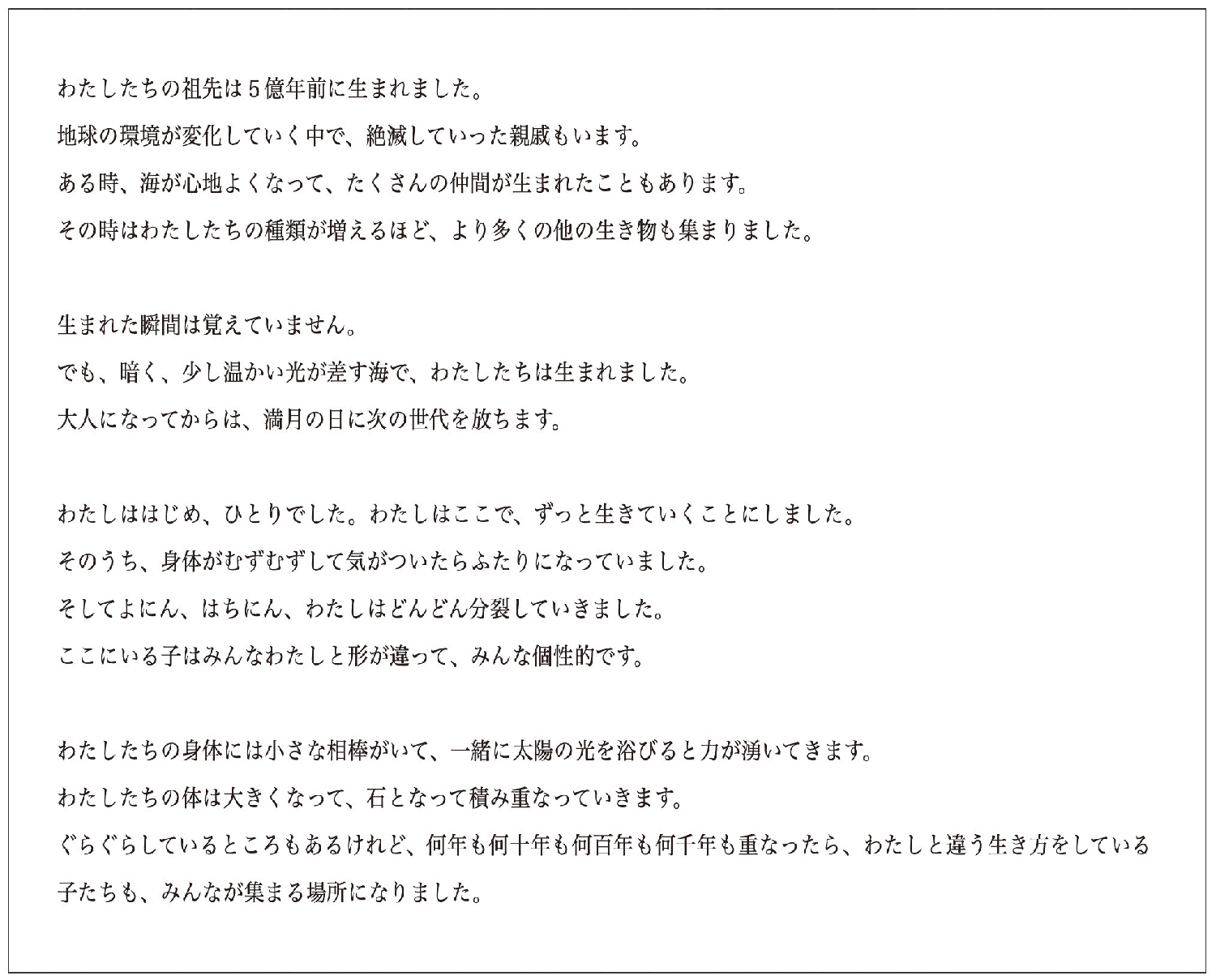 サンゴが個体の発生から群体を形成し、やがてはサンゴ礁という地形を構築していく様は、ヒトが個から集団までの社会的構成を世代を超えて維持、発展する様子と類似しています。サンゴ礁の生態系は生物多様性を確保することによって、これまでの温暖化や寒冷化、海水準の変化などのいくつもの気候変動に適応してきた強靭さを持つと同時に、水温上昇により白化してしまったり、赤土流出などの海洋汚染で埋もれてしまうような、急激な環境変化への敏感さも持っています。