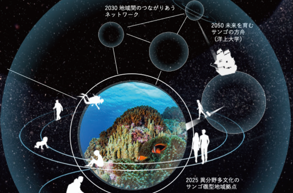 サンゴ礁が多様な自然を包み込みながら成長するように、 地域と時代を超えてヒトと自然をつなぐサンゴの方舟( 洋上大学)によって、 世界中の独自の自然と文化が尊重され共栄する未来をつくる