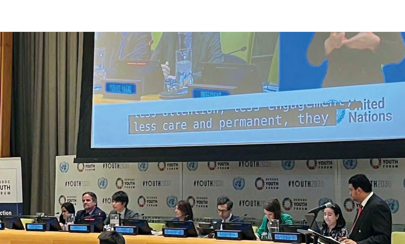 国連経済社会理事会のユースフォーラムでの登壇このように、元戦闘員の「いのち」を「まもり」、平和の担い手としてのユニークな可能性を「はぐくむ」取り組みによって、彼らのみならず、今まさに地域社会に生きる、あるいはこれから生まれてくる多くの「いのち」を「まもる」ことに貢献してきました。
