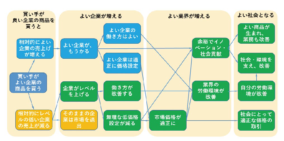 このように、買い手が良い売り手を選ぶ行動をとり、売り手が良い行動をとることで、業界も社会も良くなります。それは、従来から良い労働環境を整備したり環境負荷を下げたりして真面目に「外部不経済の内部化」の努力をしてきた企業・働き手を応援することになります。社会性のある買い手の行動により、社会性ある売り手が得をすることになります。